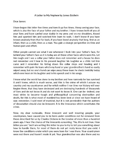 Web through “a letter to my nephew†and my research, i have found that, although there has been some racial progress through the years, racial issues still exist today. In 14 quick years, you'll enter high school. In this timely letter, james baldwin writes a letter to his nephew james.